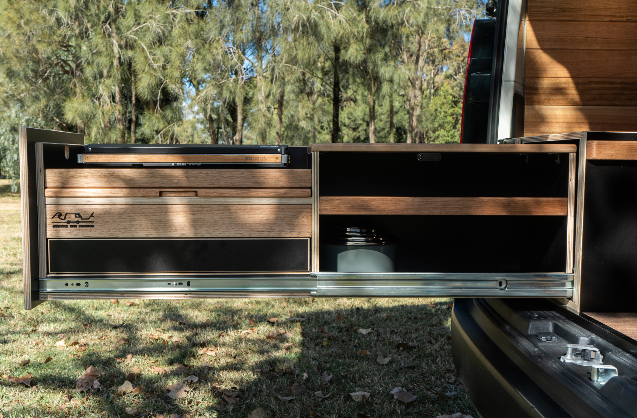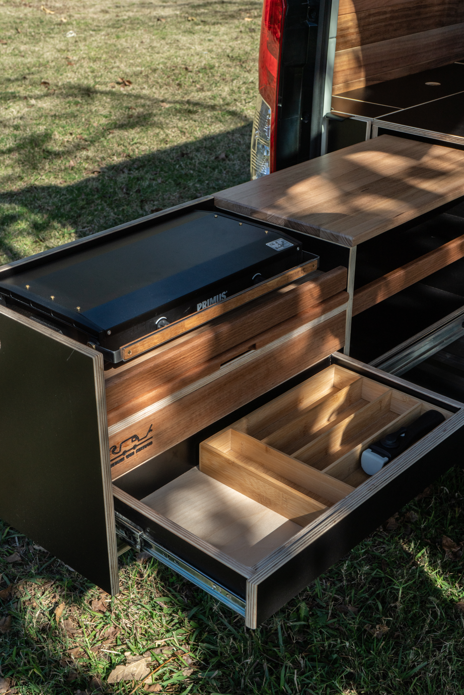 - A custom pullout kitchen unit complete with a collapsible sink and a Dometic Go water system, offering practicality and ease for on-the-go meal preparation.