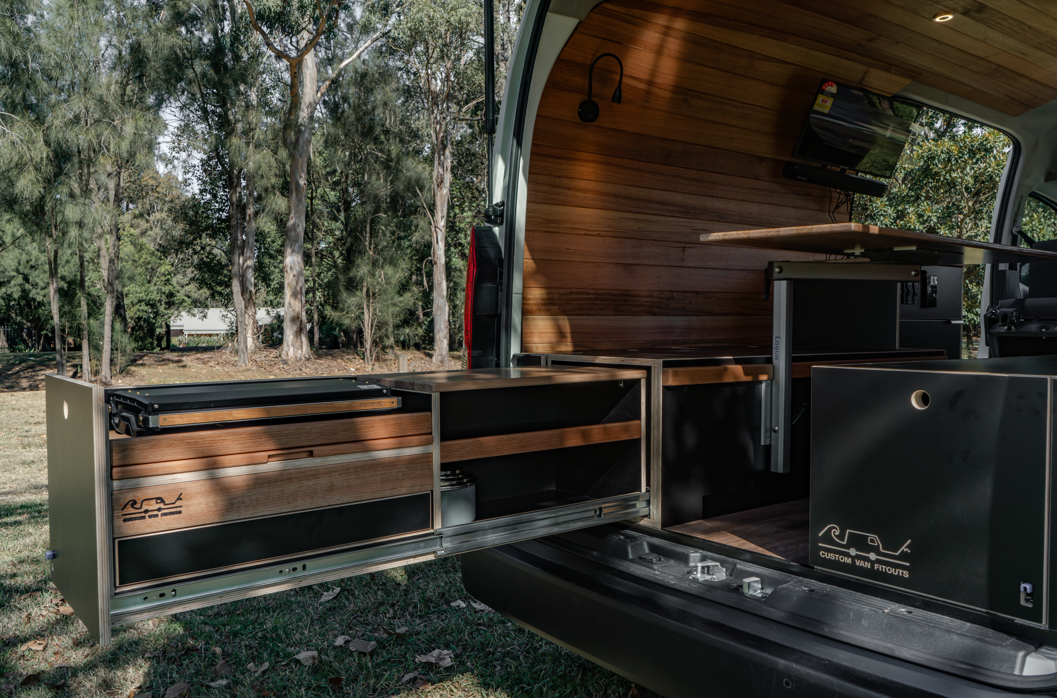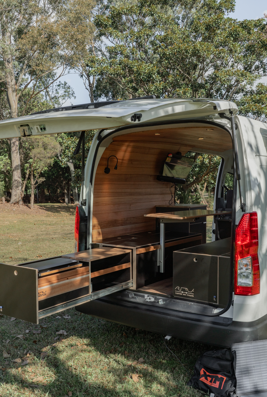 - Tasmanian oak cladding throughout, meticulously crafted to complement the Hiace's elegant curves, resulting in one of our most stunning cladding jobs to date.