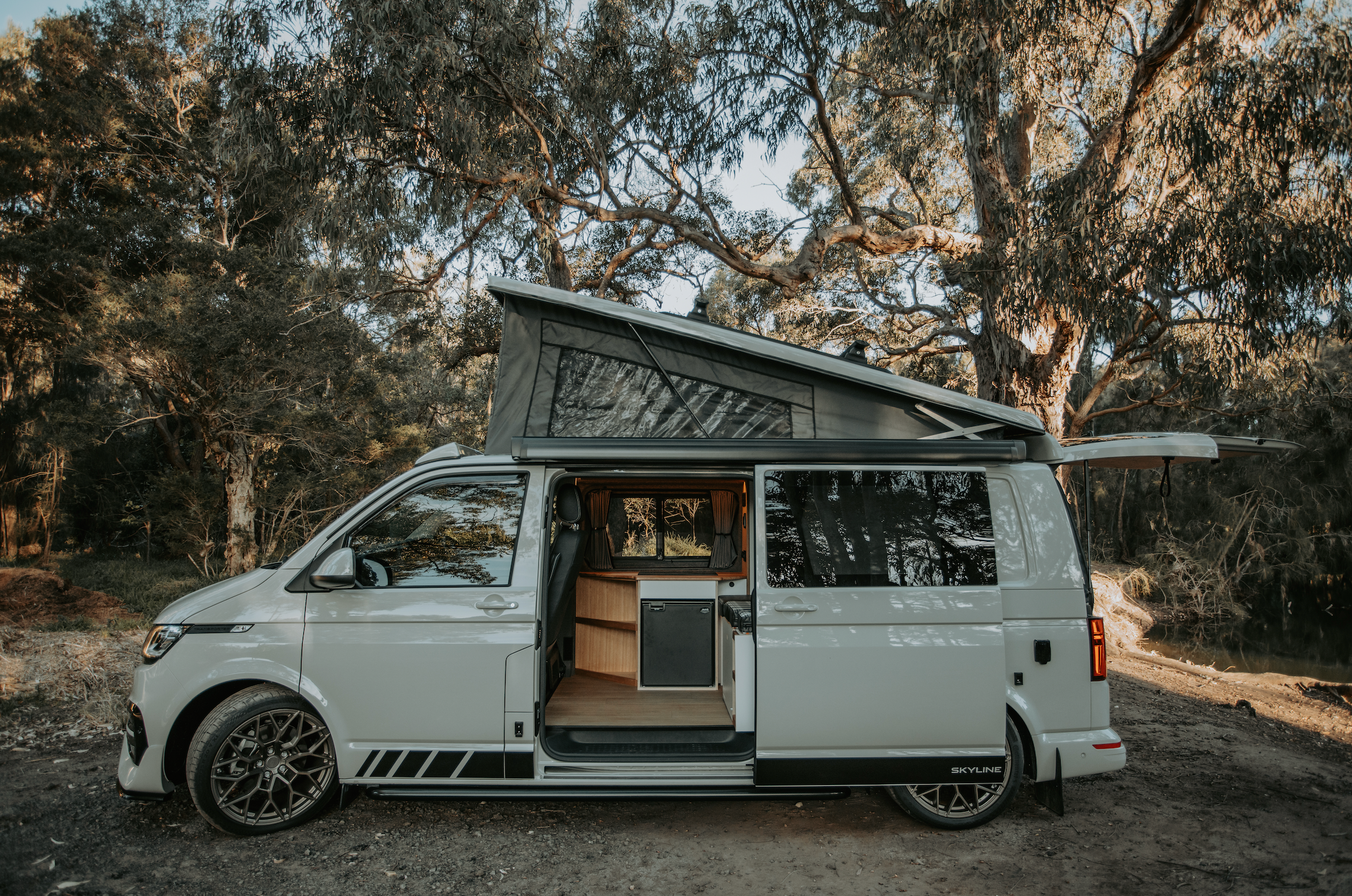 The newest model of the VW Transporter, the T6, is the last combustion engine version as VW transitions to an all-electric lineup. This model combines modern technology with sporty details, with the poptop fitout maximising usable interior space.