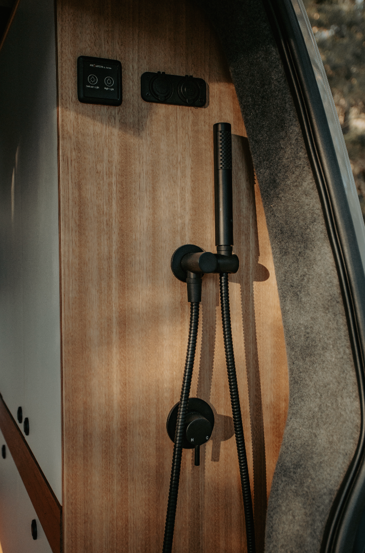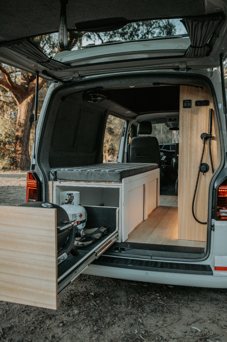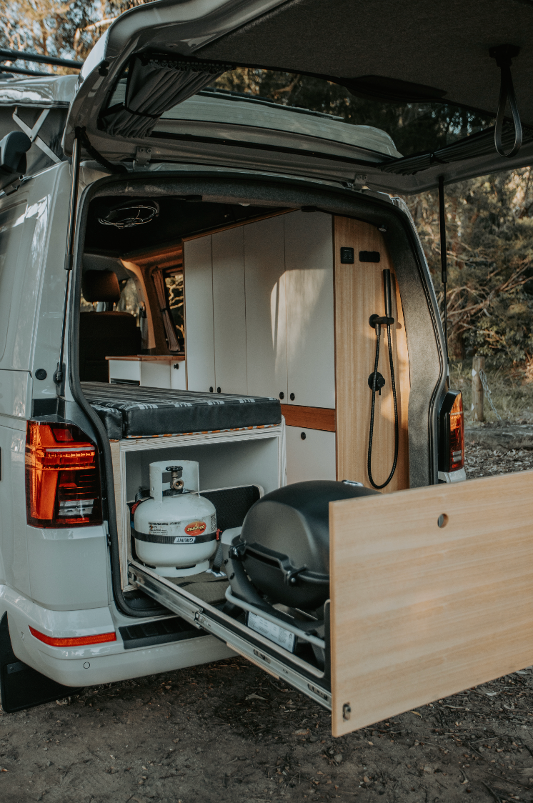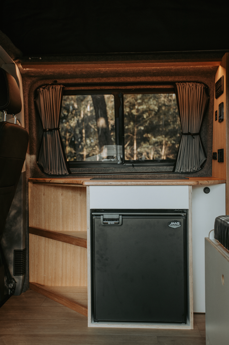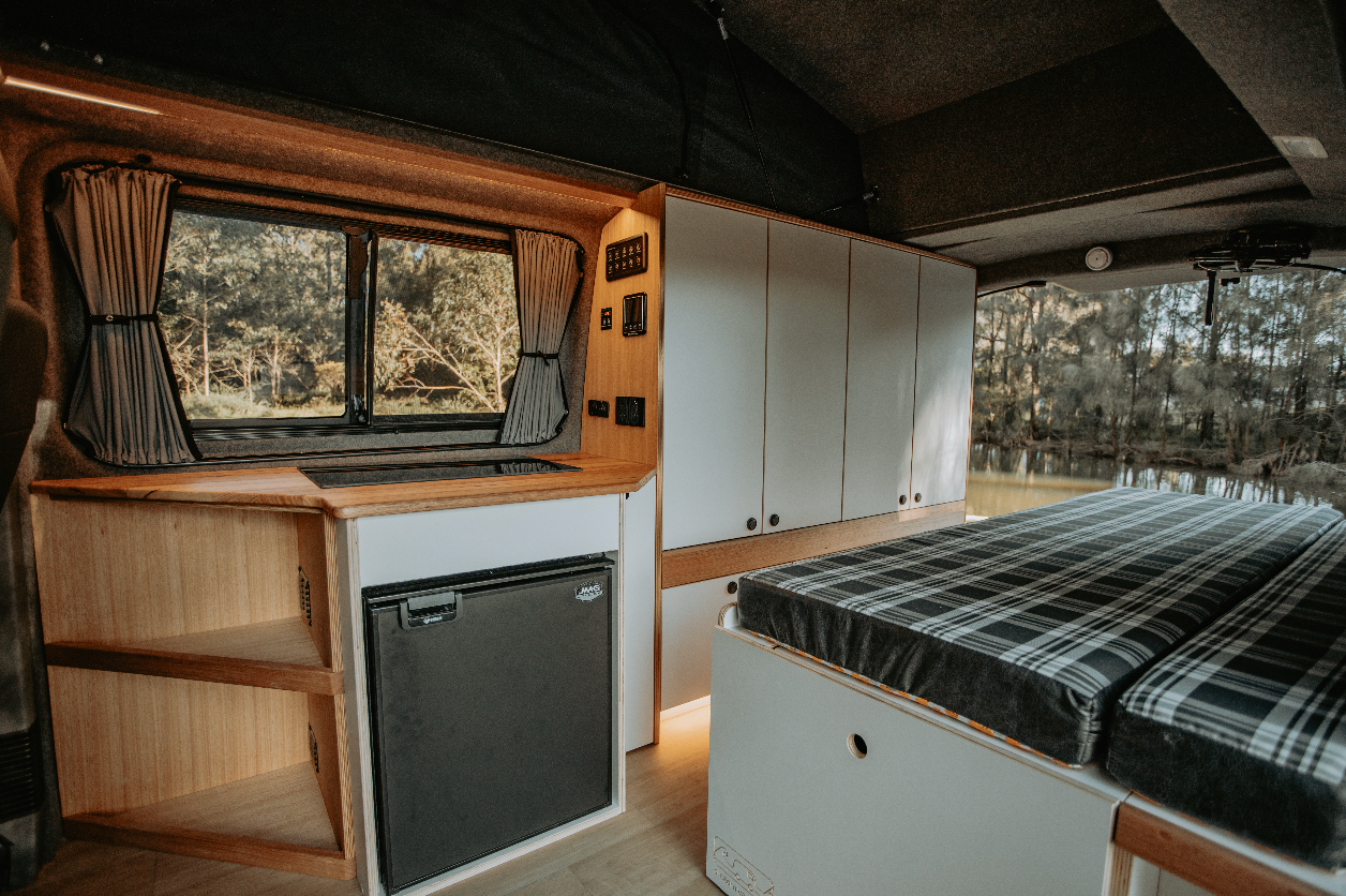 - Custom Side Cabinets: Designed to fit a Bushman 65L fridge and a Dometic double-burner induction cooktop for versatile meal preparation.