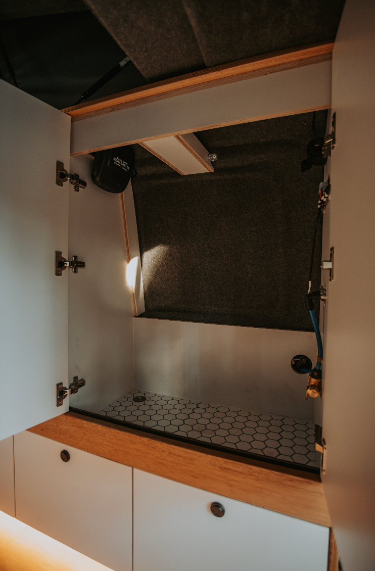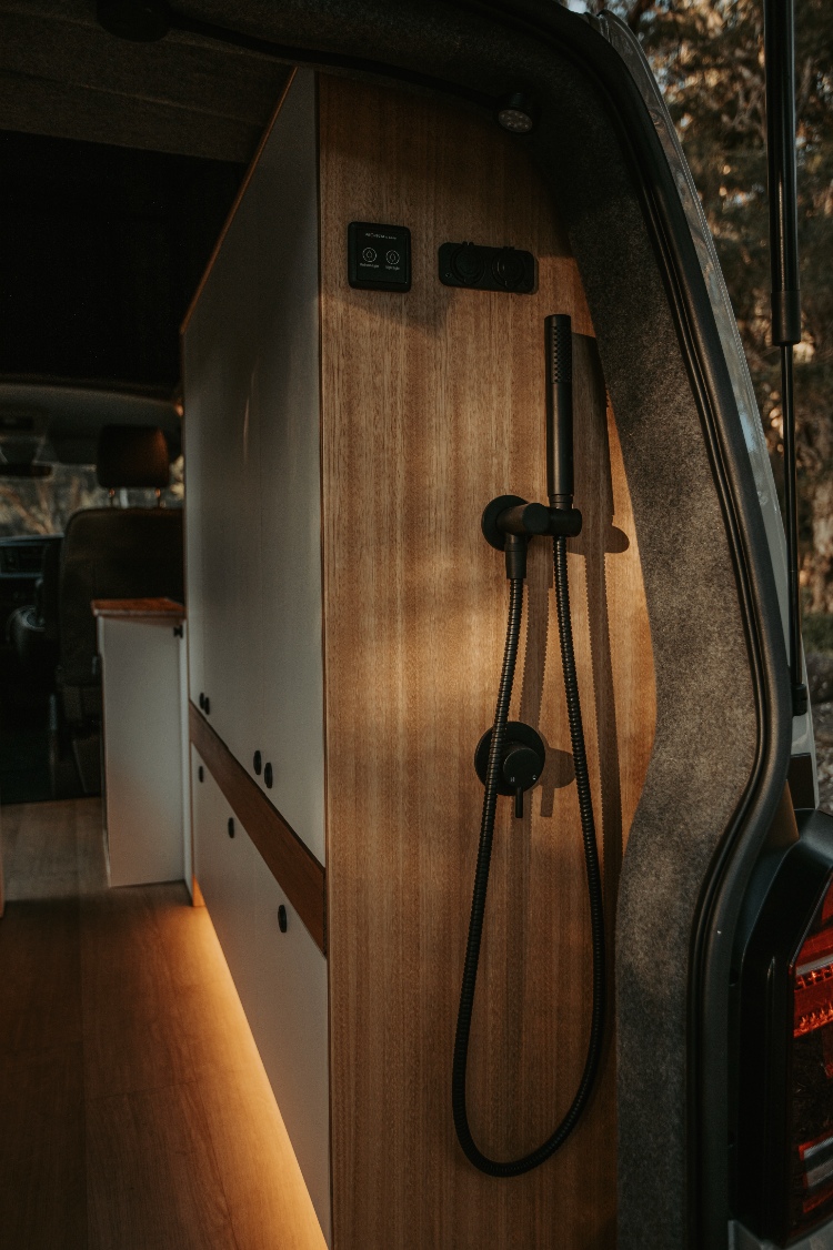 - LED Lighting: Provides a warm ambiance throughout the van.Ample Storage: Includes a custom "ski jacket" cupboard with waterproofing and ventilation for gear storage.