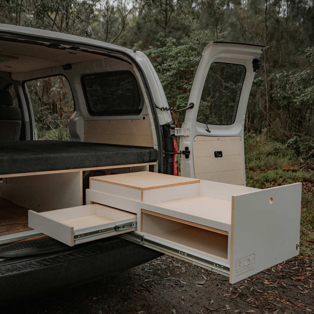A compact, slide-in kitchen pod that drops straight into the rear drawer space. Includes a bamboo benchtop for your cooker, a removable chopping board, a cutlery drawer, and two deep storage compartments — all designed for life on the road.