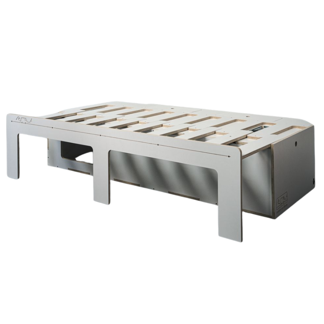 The Easy Lounge is a fully assembled, slide-out bed base that transforms your van into a functional, comfortable camper in just 10 minutes. Designed for versatility, it shifts from lounge to double bed with ease and includes a heavy-duty rear storage drawer, wheel-arch access hatches and a custom fit for popular vans.