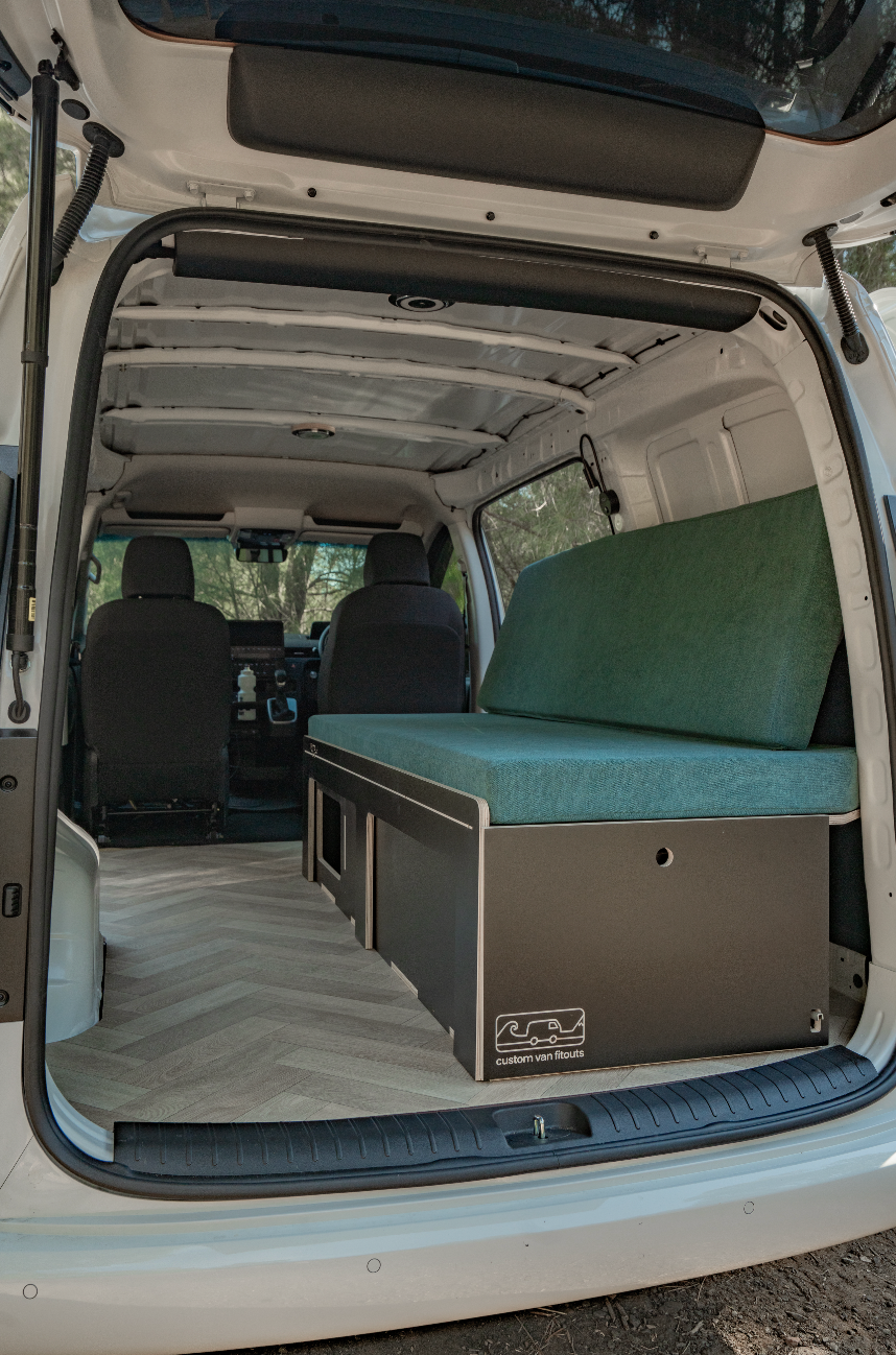 A comfortable day bed that keeps your van floor space clear — so you can haul gear, tools, boards, or whatever you do.